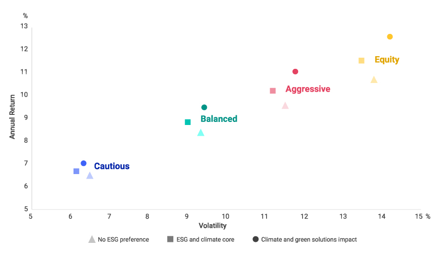 Advisers can apply a climate-first approach consistently across client risk profiles, from cautious and balanced, to aggressive and equity-only. A model portfolio can draw on two components: a core sleeve with a mix of equities and bonds that broadly integrates climate and ESG considerations and an impact sleeve with a mix of assets that reflects the investor’s specific climate and green solutions preferences.