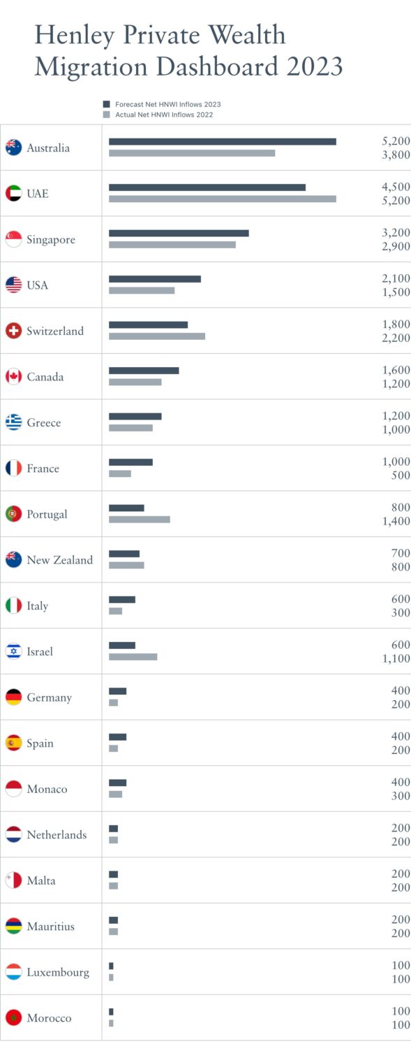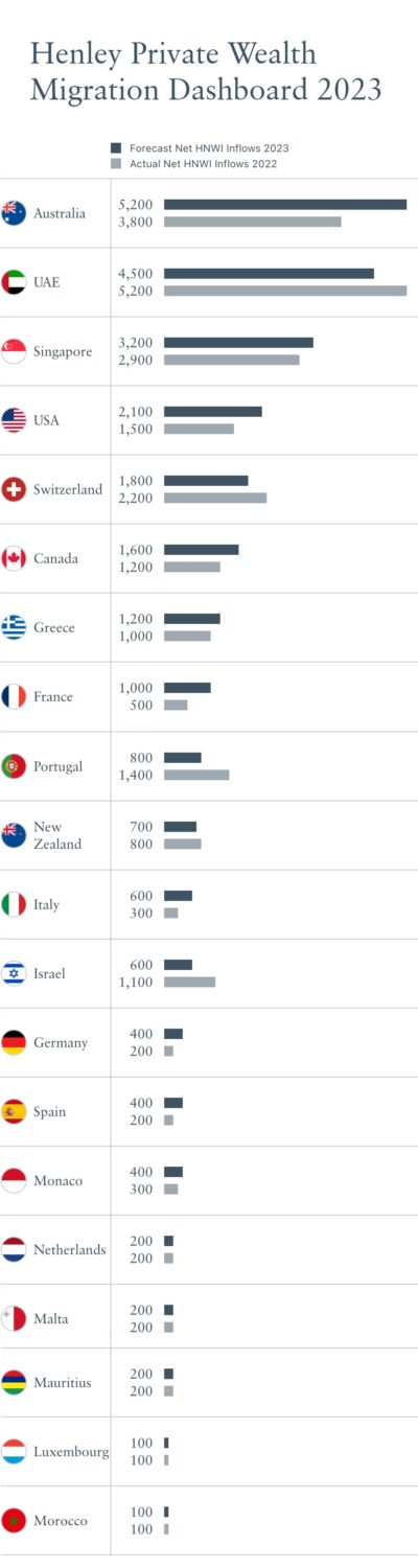 Switzerland (net inflow of 1,800) and Canada (1,600) are in 5th and 6th place, respectively, with Greece (1,200), France (1,000 — double last year’s net intake of 500 millionaires), Portugal (800), and New Zealand (700) all making it onto this year’s Top 10 list for net HNWI inflows. Israel is predicted to tumble out of the Top 10 with its net inflow of millionaires set to almost halve this year to just 600 compared to 1,100 in 2022.