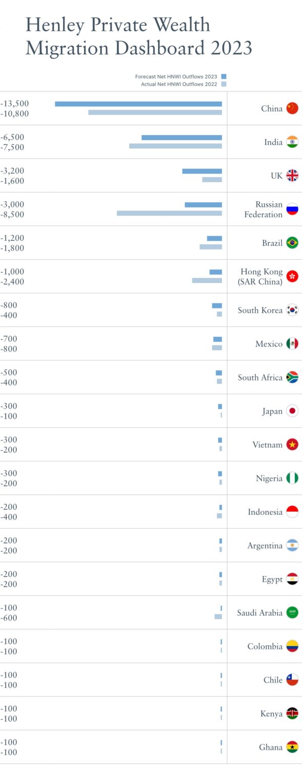The UK is expected to see a net outflow of 3,200 high-net-worth individuals (HNWIs) in 2023 — higher than the projected 3,000 net loss for Russia, according to the Henley Private Wealth Migration Report 2023.