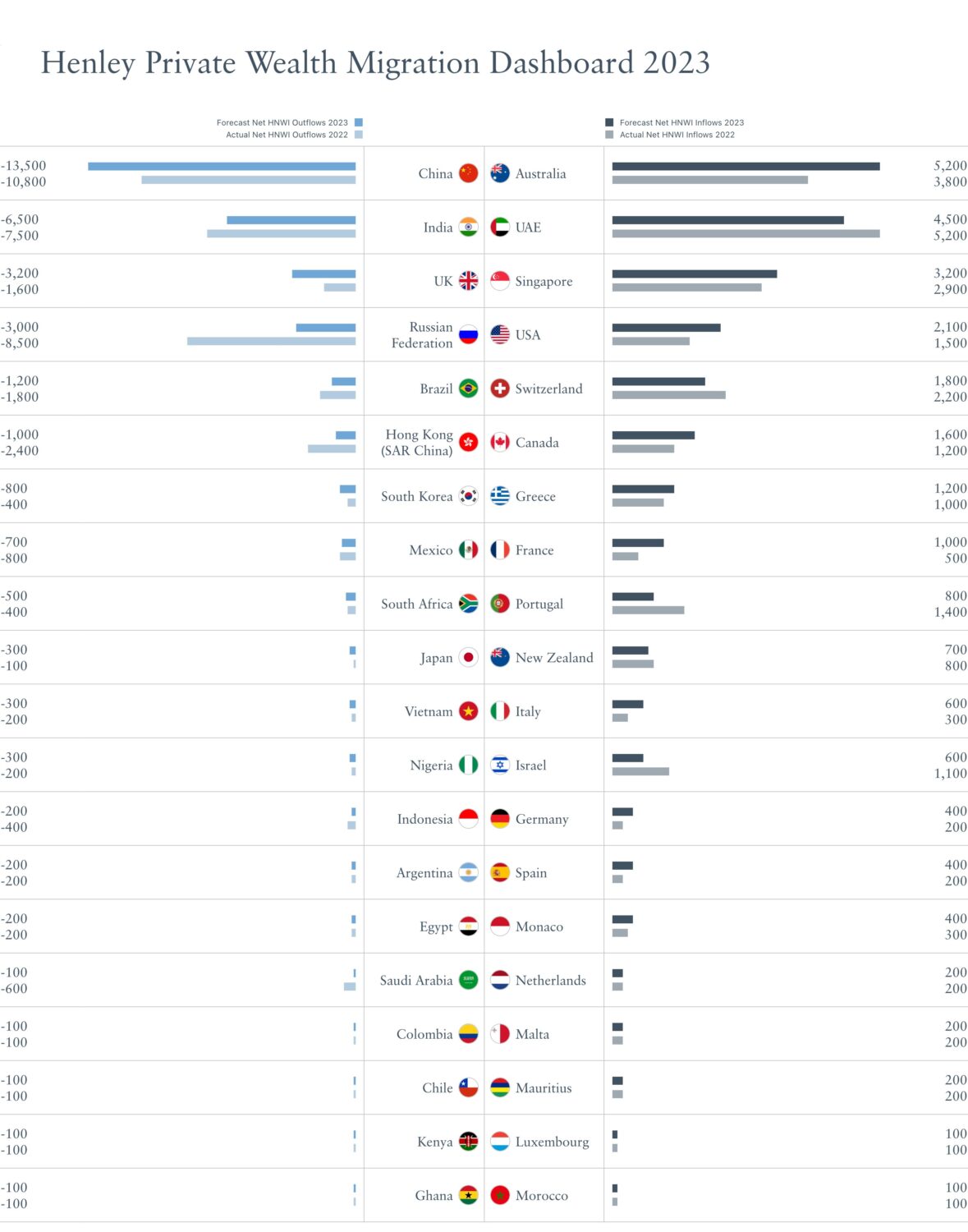 The report released by the leading international residence and citizenship advisory firm Henley & Partners exclusively features the latest net inflows and outflows of dollar millionaires (namely, the difference between the number of HNWIs with investable wealth of USD 1 million or more who relocate to and the number who emigrate from a country) as projected by global wealth intelligence firm New World Wealth, which has been tracking wealth migration trends for over a decade. The HNWI migration figures focus only on HNWIs who have truly moved — namely, who stay in their new country more than six months a year. Note: All HNWI figures are rounded to the nearest 100.